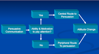Figure 1: Elaboration-Likelihood Model (Petty & Cacioppo, 1979)Indeed, the specific emotions of disgust and fear have been shown as effective in behaviour change through numerous studies covering several domains. For example, Evans et al. (1970) presented junior high school students with persuasive appeals regarding teeth cleaning. They received one of five types of persuasive appeal: High fear, lower fear and positive were all followed by specific recommendations; the fourth involved only specific recommendations and the fifth involved an elaboration of the specific recommendations. It was found that although positive communication resulted in greater information retention, high and low fear groups reported stronger intentions to behave than the positive and elaboration groups. In addition, the high fear appeal group showed greatest reported behaviour change, measured by reported tooth brushing behaviour. However, when assessing actual behaviour change, fear appeals were less effective. Therefore, fear is effective in altering reported behaviour change but not actual behaviour change.