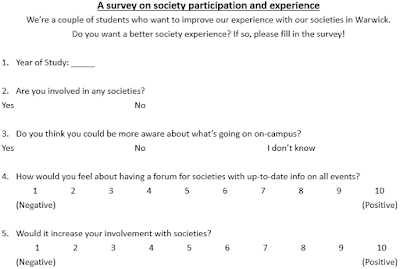 The aim of our project was to make a positive change in students’ attitude towards the participation in on-campus activities and promote the involvement in the SU societies outside their academic life. To tighten the connection between students and on-campus societies, we introduced the idea of having a forum for societies with up-to-date information on all events. We propagated our idea using a variety of mediums, including a questionnaire survey, a poster and emails to the societies officer at Warwick University.First, we carried out a survey in the library by randomly asking 52 students to fill in a short questionnaire with questions about their current involvement in societies and whether such a forum could raise their interest in society events (Figure 1).