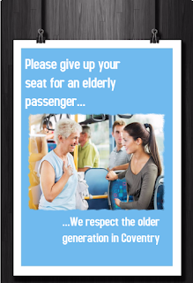The aim of the project was to reinstate the social norm of offering up one’s seat on a bus to an elderly passenger. From observation, one can see that this once social norm is disappearing. Indeed, as a control condition I observed passengers at a bus stop in Coventry. During this control condition I recorded that a mere 12% of young people offered their seat to an elderly passenger. This left the older person standing for the length of the journey, or having to make their way to the top floor of the bus. In order to encourage people to engage in the pro-social behaviour of offering their seat to an elderly passenger, two posters were created. Poster one (below) was placed at a bus stop in Binley, Coventry. The introduction of this poster saw our target behaviour (of young people offering up their bus seat to an elderly passenger) increase by 42%, compared to the control condition.. A week after the introduction of the first poster, I placed poster two (below) at the same bus stop. Poster two, on the other hand, only increased the target behaviour by 31%, compared to the control condition.
